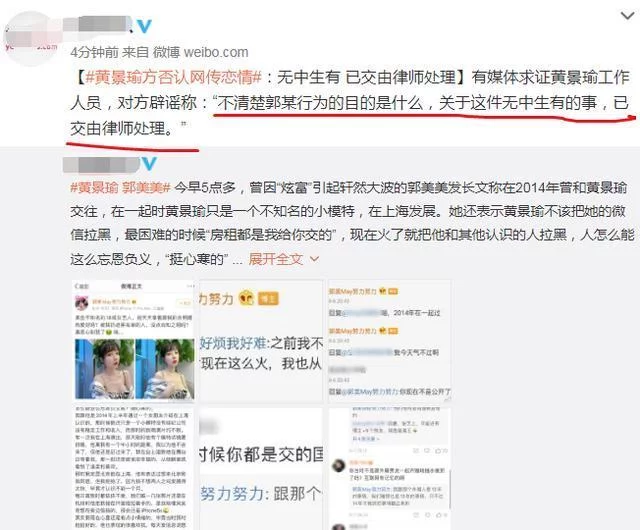 大图模式 发酵了一早上之后,黄景瑜的工作人员出来澄清,表示不清楚郭美美的目的,都是无中生有的事情,已经交给了律师处理。