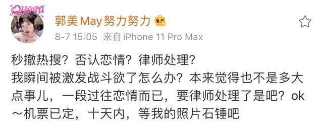 8月7日,郭美美再度回应与黄景瑜恋情一事,称将要曝出实锤:“秒撤热搜?否认恋情?律师处理?我瞬间被激发战斗欲了怎么办?本来觉得也不是多大点事儿,一段过往恋情而已,要律师处理了是吧?ok~机票已定,十天内,等我的照片石锤吧 ”。