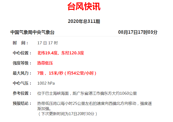 就在下午5点左右 广州发布了台风预警信号 黄埔区,南沙区,番禺区也挂上了白色预警 不过好像老天知道我在想什么了 继6号台风“米克拉”悄悄下线之后 据说,7号台风已经在慢慢生成了 而且这次很有可能正面袭击广东,粤西地区 为广东带来风雨天气 中央气象台今天下午17时继续发布热带低压预报 菲律宾吕宋岛北部近海热带低压的中心 位于广东省湛江市东偏南方大约1060公里的海面上 中心附近最大风力有7级(15米/秒) 中心最低气压为1002百帕 预计,低压中心将以每小时20公里左右的速度 向西偏北方向移动 将于今天晚上移入南海东北部海面 之后强度逐渐加强 将于明天发展为今年第7号台风“海高斯” 热带低压外围环流已甩入南海 明起广东沿海风力逐渐加大 18日 我省海面风力加大到6级~8级 南海中北部海面、巴士海峡风力 8级~9级,阵风10级~11级 19日-20日 南海中北部海面、我省海面、琼州海峡 风力9级~11级,阵风12级 其中19日珠江口内河面有6级~8级大风 随后逐渐向广东西部到海南东北部一带沿海靠近 并将于本周四凌晨到上午在上述沿海登陆 然而台风对于广州来说就是个“笑话” 国家海洋局南海预报中心10时发布海浪消息 受热带低压的影响,预计8月18-20日 南海北部海域将出现一次巨浪到狂浪过程 广东西部近岸海域将出现一次大浪以上过程 *图为18年超强台风“玛利亚”登陆的海上情景 截至今天下午广东已有17个站点 发布白色台风预警 所以热带低压影响海域航行、作业的船舶 需注意航行安全,必要时请提前回港避风 据@广州天气官方微博发布消息称 受此热带低压影响 19-20日广州市降水趋明显 有中雷雨局部暴雨 希望即将生成的7号台风 能给大家带来清凉,不要带来灾害损失 所以大家出门记得带好雨伞 风雨天气尽量在室内,切勿出门 |